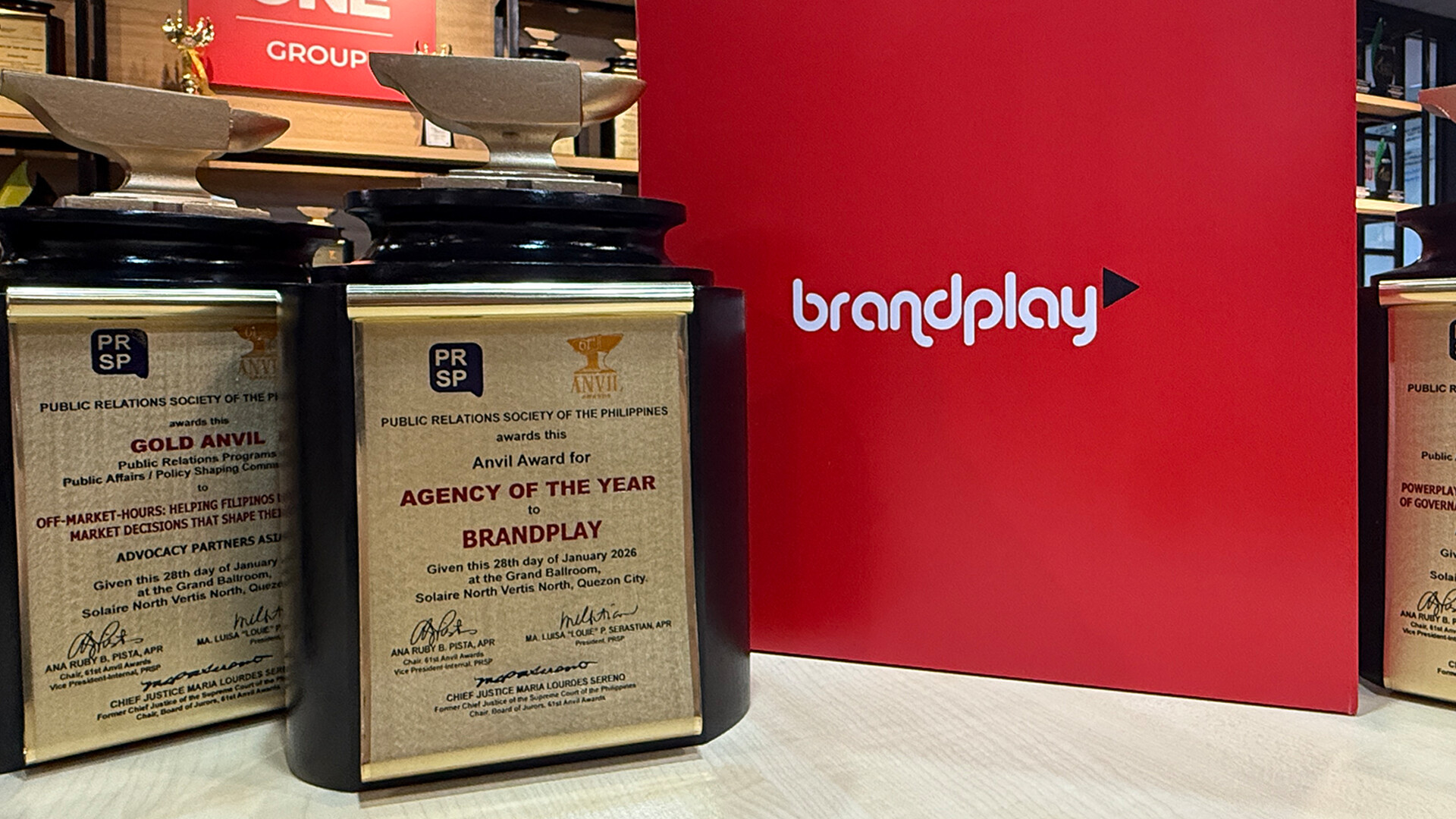 Brandplay, one of the agencies in PAGEONE Group, was named Agency of the Year at the 61st Anvil Awards of the Public Relations Society of the Philippines, after winning a total of 26 trophies across multiple categories.