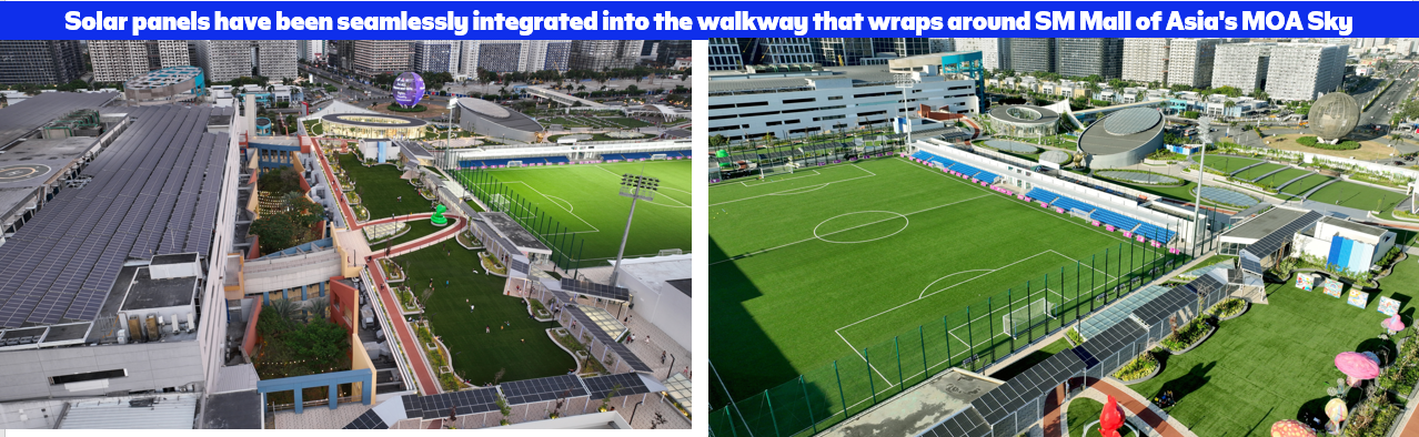 Across the SM Mall of Asia’s MOA Sky, solar panels have been seamlessly integrated into the walkway that wraps around the property—doubling as overhead covering for mallgoers strolling and enjoying leisurely walks.